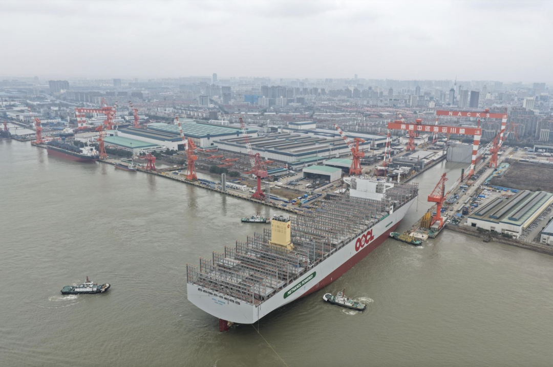 本次下水的24000标箱甲醇双燃料集装箱船,由南通中远海运川崎船舶工程有限公司自主研发设计。该船采用先进的甲醇双燃料动力系统,兼具高效能与低排放特性,在全程运营中可实现“碳中和”目标。