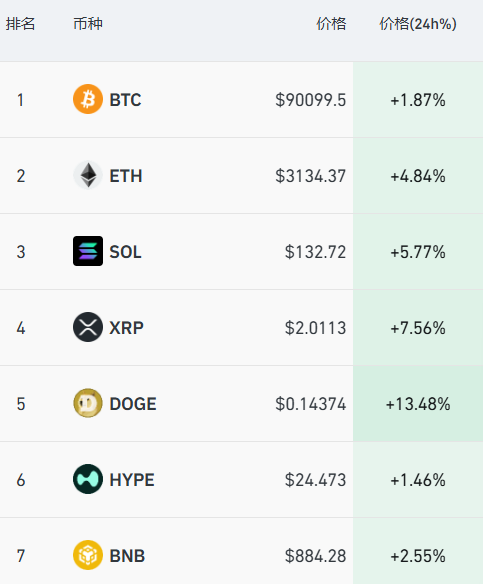 加密货币方面,多个主要币种集体上涨,比特币重新站上90000美元关口,过去24小时,全市场超11万人被爆仓。