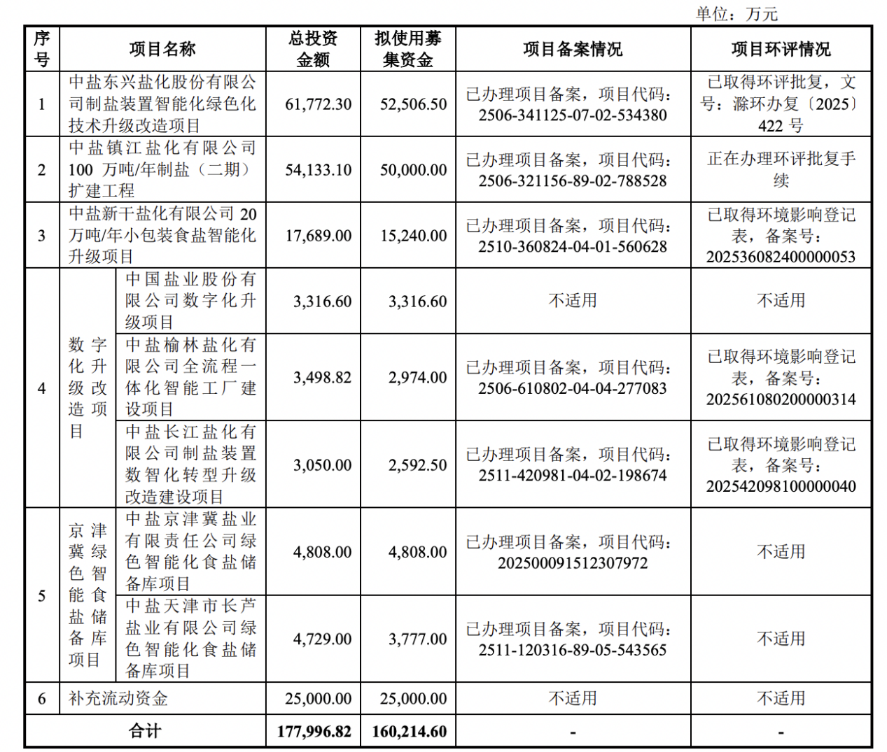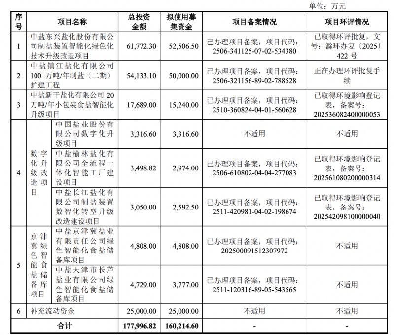 本次IPO,中盐股份拟募集资金16.02亿元,将用于中盐东兴盐化股份有限公司制盐装置智能化绿色化技术升级改造项目、中盐镇江盐化有限公司100万吨/年制盐(二期)扩建工程、中盐新干盐化有限公司20万吨/年小包装食盐智能化升级项目等。