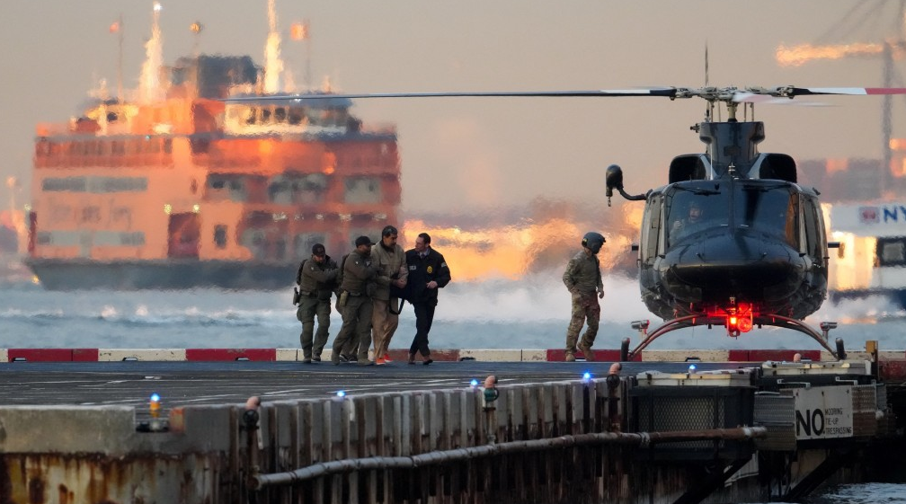 ▲马杜罗戴上手铐,由直升机送往纽约法庭。 路透社