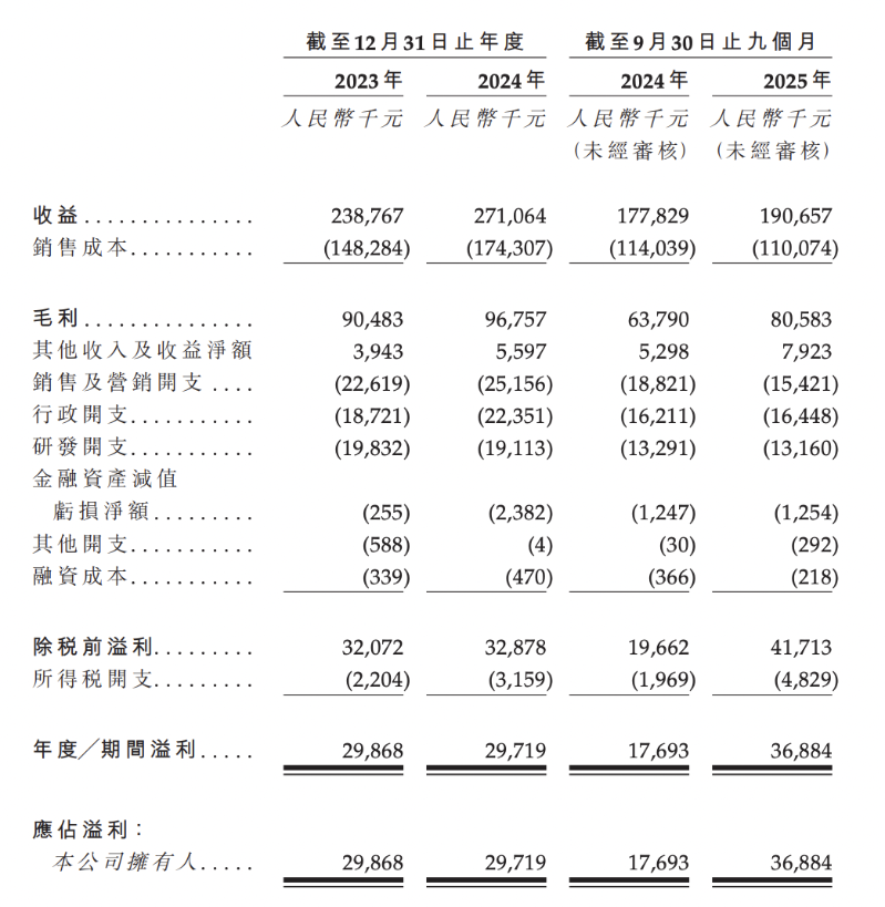 2023年、2024年及2025年前9月,万怡医学收益分别为2.39亿元、2.71亿元、1.91亿元,年度/期间溢利分别为2986.8万元、2971.9万元及3688.4万元,毛利率分别为37.9%、35.7%、42.3%。