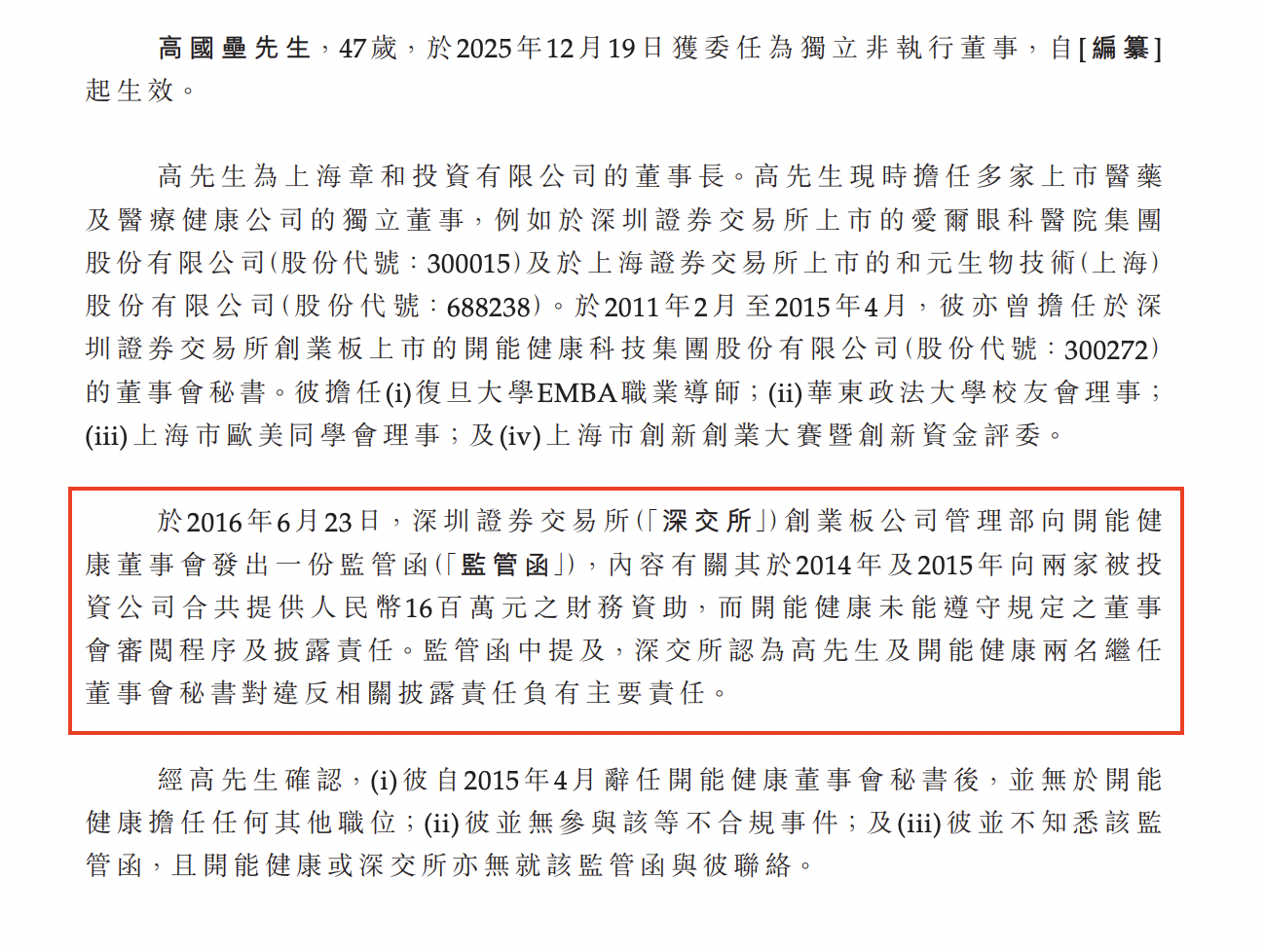 经高国垒确认,他自2015年4月辞任开能健康董事会秘书后,并无于开能健康担任任何其他职位;他并无参与该等不合规事件;及他并不知悉该监管函,且开能健康或深交所亦无就该监管函与其联络。