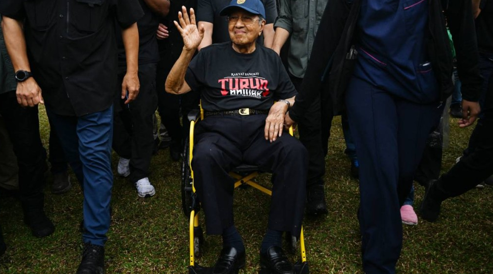 ▲马来西亚百岁前首相马哈蒂尔家中摔倒入院。图为他去年坐轮椅出席群众活动。法新社