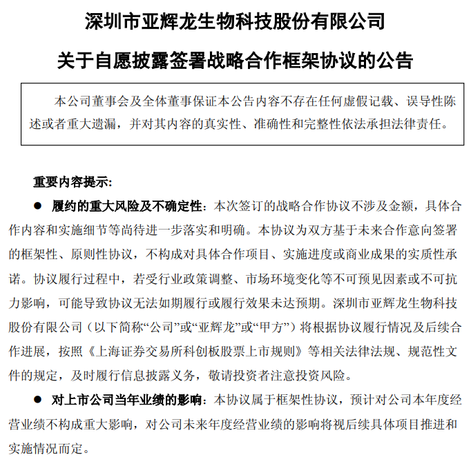 1月6日晚间,深圳市亚辉龙生物科技股份有限公司(688575.SH,以下简称"亚辉龙")公告披露,公司于当日收到上海证券交易所科创板公司管理部下发的问询函,要求公司就与深圳脑机星链科技有限公司(以下简称"脑机星链")签署战略合作框架协议事项进行补充说明。
