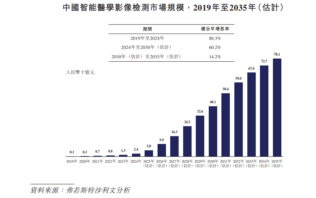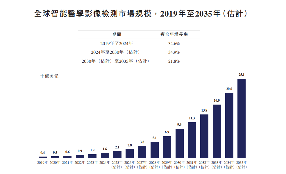 智能医学影像检测是指利用计算器及深度学习技术,对医学影像进行自动识别、定量分析,为临床提供辅助诊断。智能医学影像检测市场的市场规模方面,根据弗若斯特沙利文的资料,全球市场由2019年的4亿美元增至2024年的16亿美元,复合年增长率为34.6%。预期将于2030年达93亿美元,并于2035年达251亿美元,各期间的复合年增长率分别为34.9%及21.8%。
