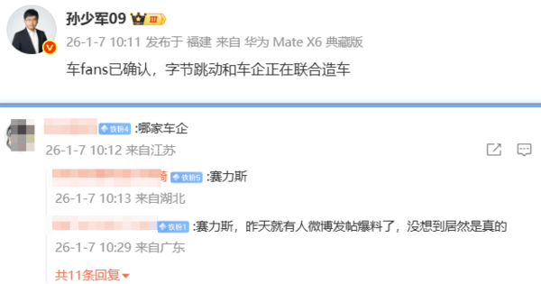 1月7日,博主“孙少军09”爆料称“车fans已确认,字节跳动和车企正在联合造车”。在相关评论区的讨论中,有网友留言指出合作车企或为赛力斯,表示此前已有相关爆料。