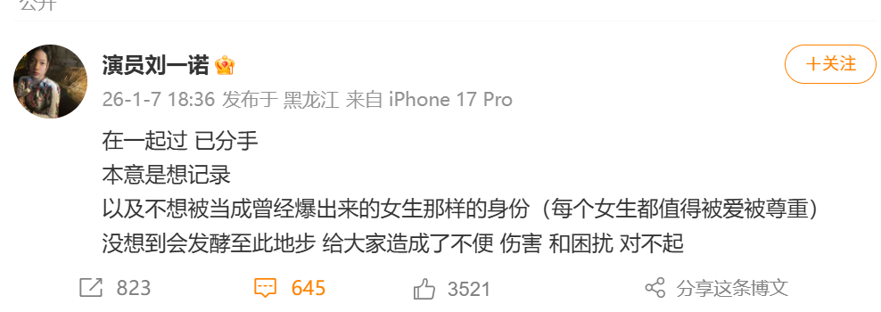 刘一诺发文回应:“在一起过,已分手,本意是想记录,以及不想被当成曾经爆出来的女生那样的身份(每个女生都值得被爱被尊重,没想到会发酵至此地步,给大家造成了不便、伤害和困扰,对不起。 ”