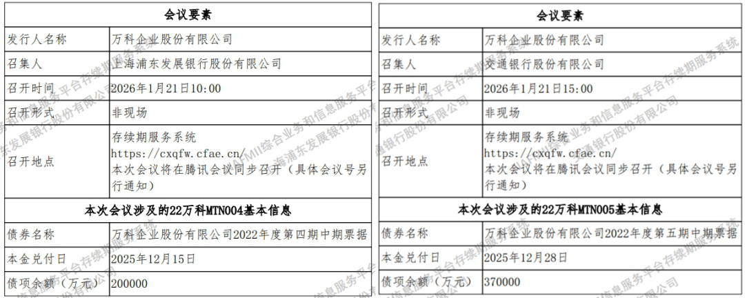 根据1月7日晚间公告,两笔中票最新的持有人会议已确定时间。其中,“22万科MTN004”将于1月21日上午10点再次召开持有人会议;“22万科MTN005”持有人会议则于1月21日下午3点召开。