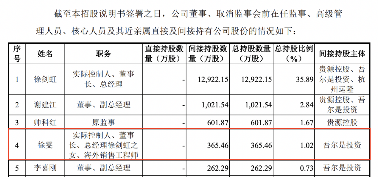 另外,徐剑虹之女徐雯任海外销售工程师,间接持股1.02%。