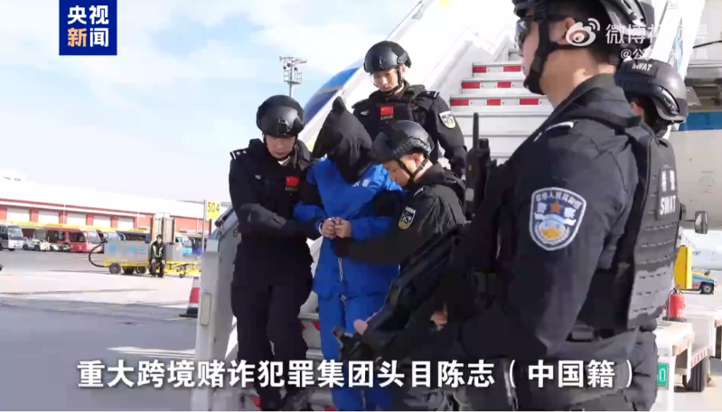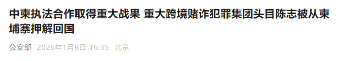 1月7日,在柬埔寨有关部门支持配合下,公安部派出工作组,成功将重大跨境赌诈犯罪集团头目陈志(中国籍)从柬埔寨金边押解回国。这是中柬执法合作取得的又一重大战果。