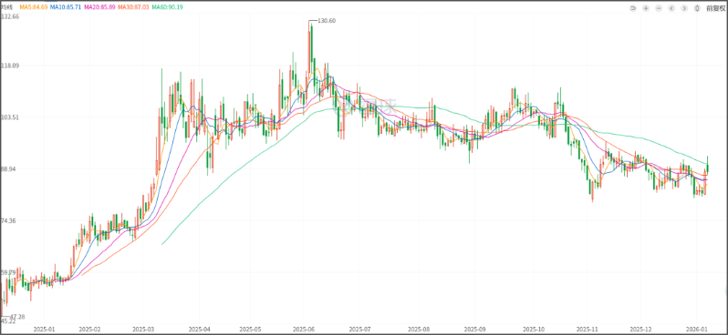 但限售期结束时,毛戈平公司股价已较上市后高点大幅回落,导致毛戈平家族套现市值缩水。数据显示,毛戈平公司上市发售价为29.8港元/股,上市半年后股价一度飙升至130.60港元/股,总市值突破624亿港元;但此后股价震荡向下,至2026年1月7日收盘时总市值接近431亿港元,较高点蒸发约193亿港元。