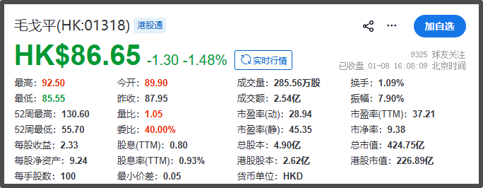 截至1月8日收盘,毛戈平公司报86.65港元/股,当日下跌1.48%,港股市值226.89亿港元。