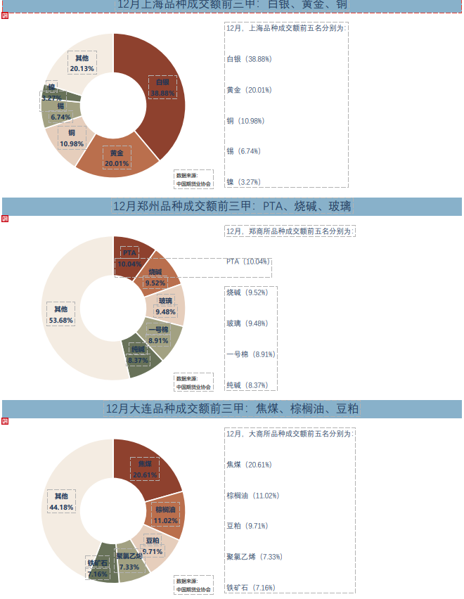 其中,按照成交额统计,排名各商品期货交易所前三的品种分别为上期所的白银、黄金、铜,郑商所的PTA、烧碱、玻璃,大商所的焦煤、棕榈油、豆粕,广期所的碳酸锂期货、多晶硅期货、铂期货;按照成交量统计,排名各交易所前三的品种分别为上期所的白银、螺纹钢、白银期权,郑商所的玻璃、PTA、甲醇,大商所的豆粕、聚氯乙烯、焦煤,广期所的碳酸锂期货、碳酸锂期权、工业硅期货。