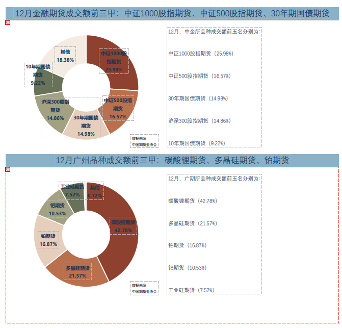 中国金融期货交易所的金融期货期权成交量为2,742.7万手,占全国市场的2.88%;成交额为23.87万亿元,占全国市场的26.29%。成交金额排名前三的品种分别是中证1000股指期货、中证500股指期货、30年期国债期货。