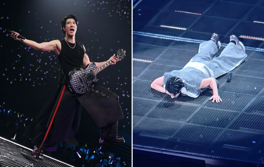 ▲王力宏的项链卡在舞台地板的缝隙,一度无法起身。 (图/微博@王力宏、小红书)