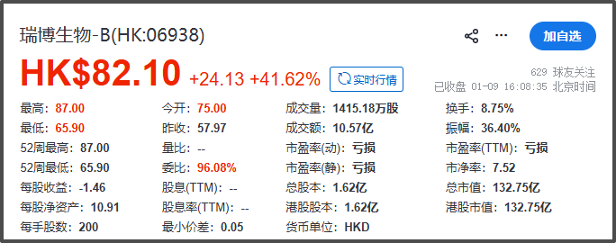截至1月9日收盘,瑞博生物股价为82.05港元/股,涨幅41.54%,总市值132.67亿港元。