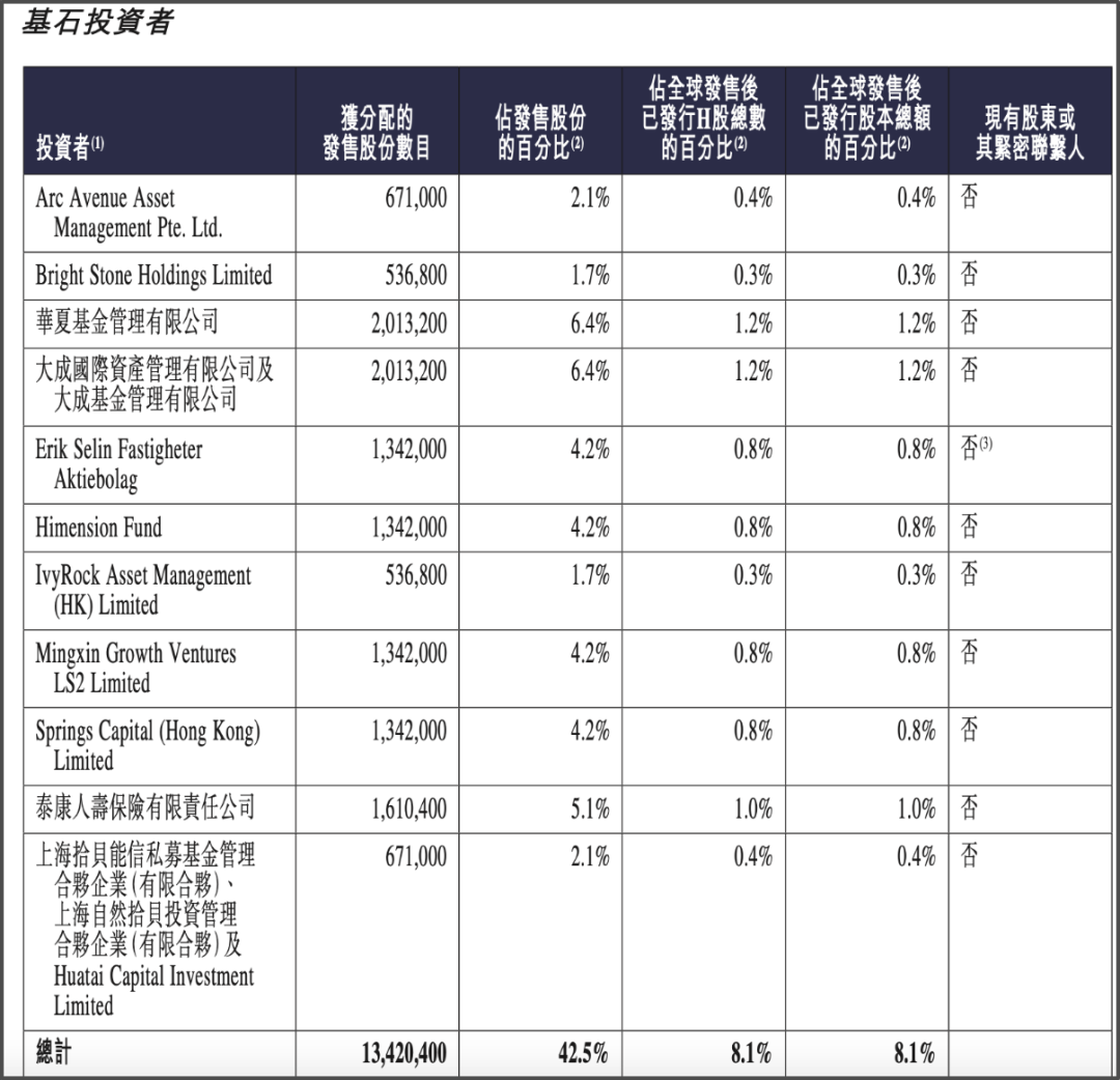 招股期间,瑞博生物获得了华夏基金、大成国际、大成基金、泰康人寿,以及Arc Avenue、Bright Stone等国际投资机构的青睐,12家基石投资者为其“兜底”,共认购股份1342.04万股,占全球发售股份总数的42.5%,总认购金额约1亿美元。