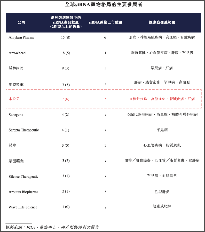 但中国尚未有自主研发的小核酸药物获批上市,国内药企中,除了瑞博生物,还有圣诺医药、舶望制药、靖因药业等拥有小核酸药物研发管线。