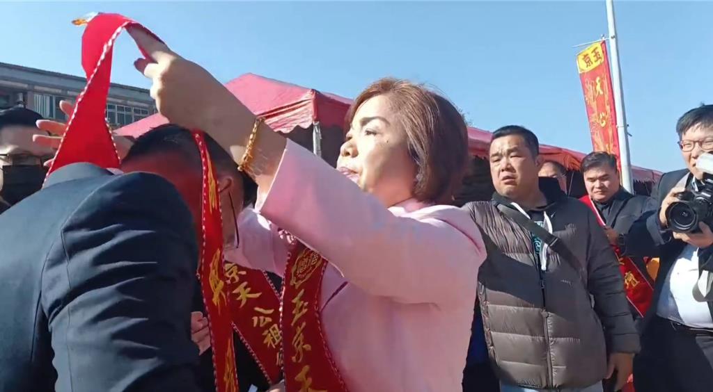 ▲杨琼璎广邀蓝营大咖,党主席郑丽文、台中市长卢秀燕、“立法院长”韩国瑜等人参加清水区玉京天公祖总庙龙柱大典。