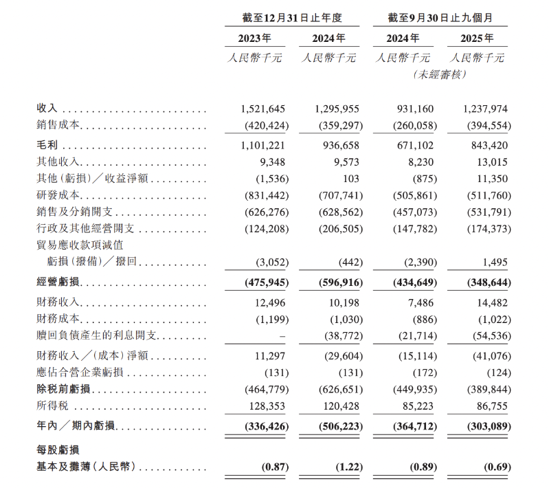 2023年、2024年及2025年前9月,先声再明收入分别为15.22亿元、12.96亿元、12.38亿元,年内╱期内亏损分别为3.36亿元、5.06亿元、3.03亿元,毛利率分别为72.4%、72.3%、68.1%。
