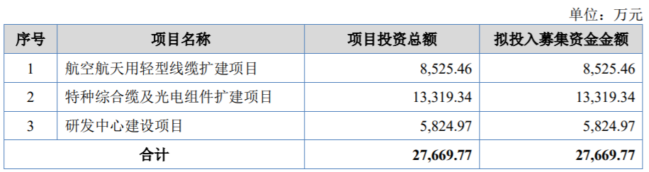 本次IPO,文峰光电拟投入募集资金金额2.77亿元,分别用于航空航天用轻型线缆扩建项目、特种综合缆及光电组件扩建项目及研发中心建设项目。