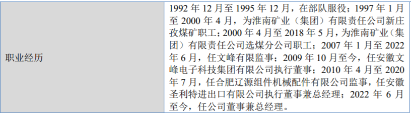 徐文峰,男,出生于1975年1月1日,高中学历。他于1992年12月至1995年12月,在部队服役;1997年1月至2000年4月,为淮南矿业(集团)有限责任公司新庄孜煤矿职工;2000年4月至2018年5月,为淮南矿业(集团)有限责任公司选煤分公司职工;2007年1月至2022年6月,任文峰有限监事;2009年10月至今,任安徽文峰电子科技集团有限公司执行董事;2010年4月至2020年7月,任合肥辽源组件机械配件有限公司监事,任安徽圣利特进出口有限公司执行董事兼总经理;2022年6月至今,任公司董事兼总经理。