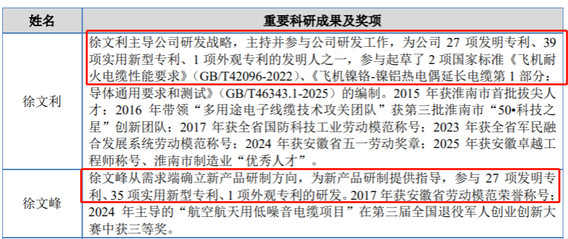 招股书披露,徐文利是公司核心技术人员之一,主导公司研发战略,主持并参与公司研发工作,为公司27项发明专利、39项实用新型专利、1项外观专利的发明人之一,参与起草了2项国家标准《飞机耐火电缆性能要求》(GB/T42096-2022)、《飞机镍铬-镍铝热电偶延长电缆第1部分:导体通用要求和测试》(GB/T46343.1-2025)的编制。