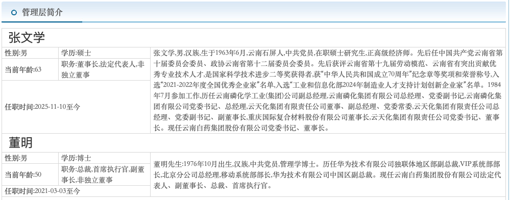 在张文学正式履职之前,云南白药由总裁董明代行董事长职责。入职云南白药前,董明曾是华为技术有限公司中国区副总裁。