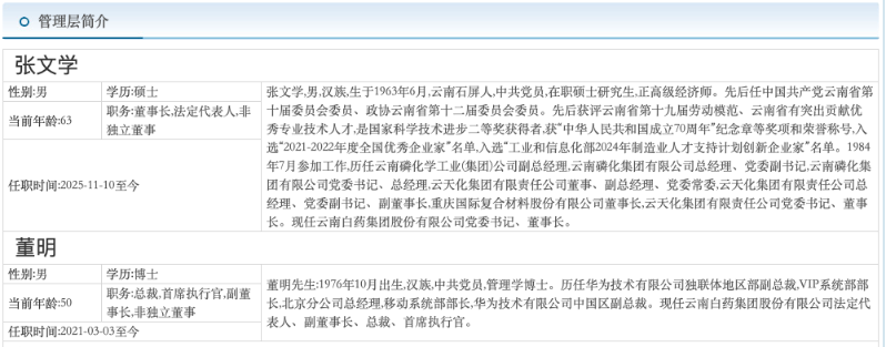 张文学,生于1963年6月,今年63岁,云南石屏人,1984年7月参加工作,历任云南磷化集团总经理、党委书记等,后任云天化集团有限责任公司党委书记、董事长。