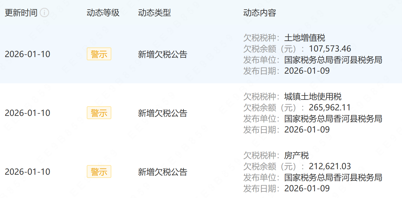 ▲廊坊项目公司新增欠税公告,资料来源:企查查