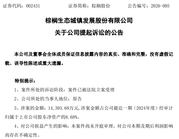 1月12日,棕榈股份收到鹤壁市法院出具的《受理案件通知书》(案号为(2026)豫0611民初358号),鹤壁市法院已决定受理此案。