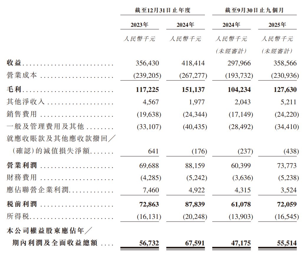 公司于2023年度、2024年度、2025年截至9月30日止九个月分别录得溢利为5673.2万元、6759.1万元、5551.4万元人民币。