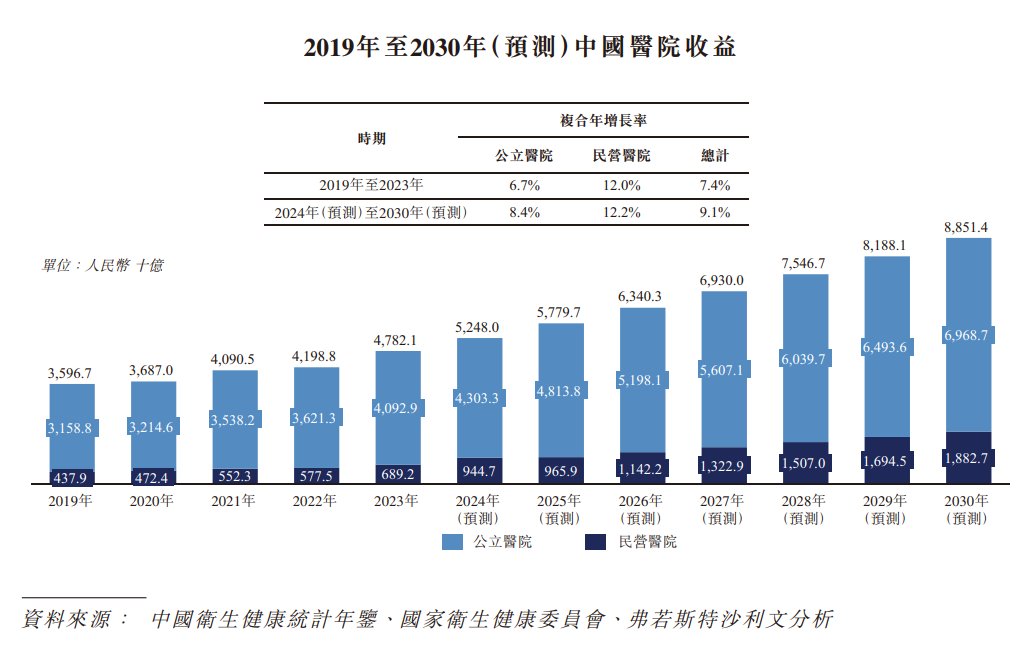 民营医院的收益由2019年的人民币4379亿元增长至2023年的人民币6892亿元,2019年至2023年的复合年增长率为12.0%,2019年至2023年的复合年增长率为12.0%,并预计将于2030年达到人民币1.88万亿元,2024年至2030年的复合年增长率为12.2%。同期,公立医院于2019年至2023年的复合年增长率为6.7%,预计于2024年至2030年的复合年增长率将为8.4%。