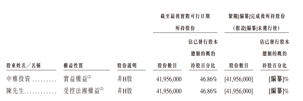 中雅投资拥有公司已发行股本总额约46.86%的权益。中雅投资分别由公司的董事长兼执行董事陈先生及陈凯先生拥有90%及10%的权益。因此,陈先生、陈凯先生及中雅投资构成一组控股股东。陈凯先生为陈先生的儿子。