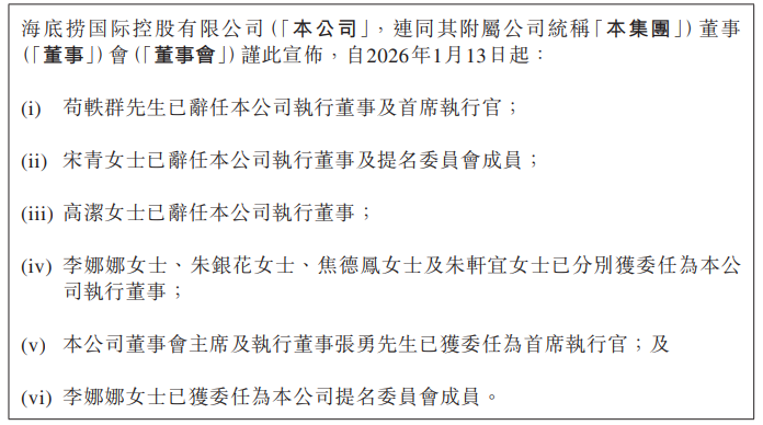 1月13日,海底捞(6862.HK)发布人事公告,创始人张勇时隔4年再度出任CEO,接替苟轶群统筹经营管理;同时完成董事会成员大调整,苟轶群、宋青、高洁三位原执行董事辞任相关高管职务,李娜娜、朱银花、焦德凤、朱轩宜4位内部培养的女性管理者接任,李娜娜同步加入提名委员会。