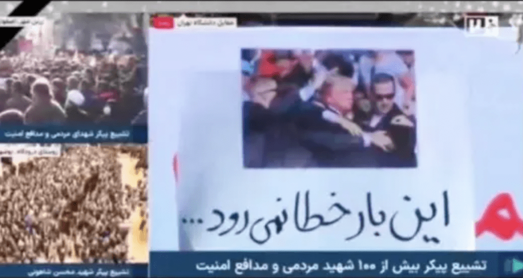有关画面显示,受伤流血的特朗普形象,据信来自伊朗一场亲政府集会。尽管伊朗因全国性示威而实施通讯与媒体封锁,有关节目仍获准播出。