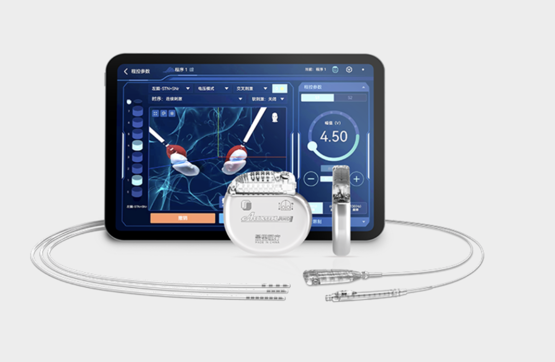 ▲申办企业生产的脑深部电刺激系统,其中包括刺激器、导线、电池、体外程控器。网络截图
