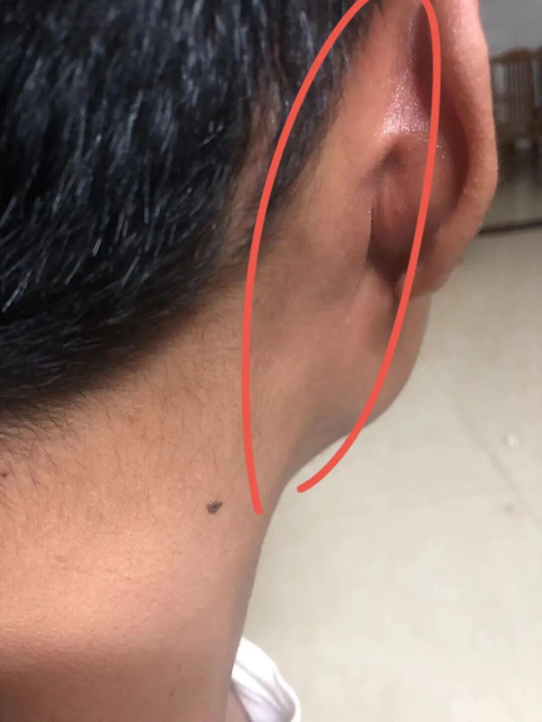 ▲一位受试者术后能看见耳朵侧边的导线形状。受访者供图
