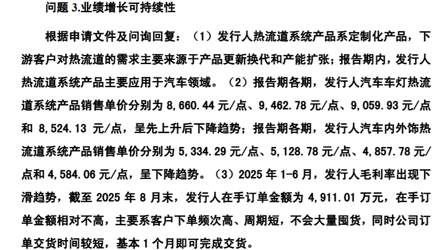2025年1-6月,恒道科技毛利率出现下滑趋势,截至2025年8月末,恒道科技在手订单金额为4,911.01万元,在手订单金额相对不高,主要系客户下单频次高、周期短,不会大量囤货,同时公司订单交货时间较短,基本1个月即可完成交货。