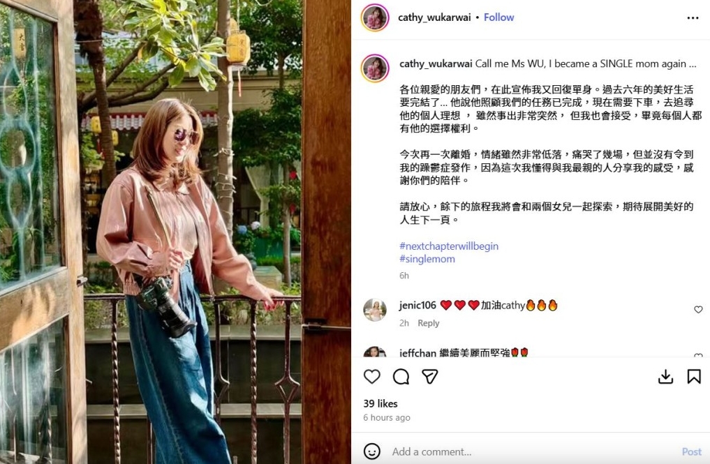 2002年香港小姐季军胡家惠(Cathy)去年11月宣布与第二任丈夫Manfred Lau离婚,结束了3年的婚姻。胡家惠曾在帖文称过去六年的美好生活要完结了:“他说他照顾我们的任务已完成,现在需要下车追寻他的个人理想。”胡家惠删除与前夫的合照后曾表示:“余下的旅程我将会和两个女儿一起探索,期待展开美好的人生下一页。”