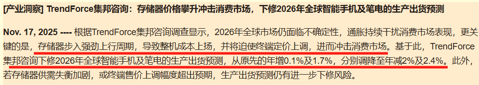 TrendForce集邦咨询指出,存储占手机整机成本的10%-15%,涨价潮将直接推高智能手机成本8%-10%。该机构预计,2026年全年的手机和笔电出货量将下滑2%-2.4%。