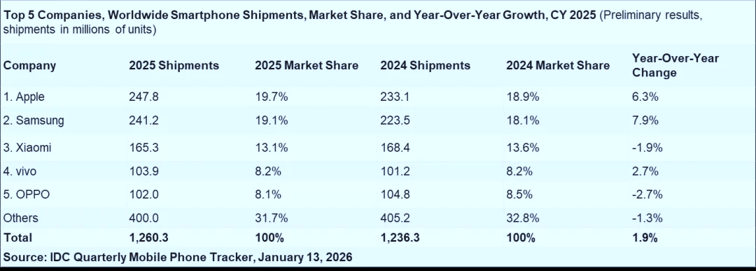 IDC数据显示,2025年全年OPPO出货量为1.02亿台,同比下降2.7%,市场份额8.1%,落后于vivo,排名第五,较2024年下降一位。但若加上realme的销量,OPPO的整体出货量将有望向排名第三的小米发起冲击。