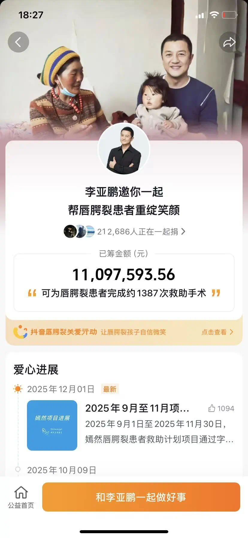 据蓝鲸新闻报道,1月16日,李亚鹏在个人账号开直播,谈及网友捐款情况,称已有超过18万网友为嫣然天使儿童医院捐款超过900万元,这些费用可支撑为超过1000名唇腭裂患儿手术。
