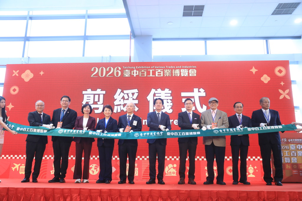 ▲台中百工百业博览会16日于国际会展中心盛大开幕,赖清德(右五)、市长卢秀燕(左四)出席剪彩仪式。