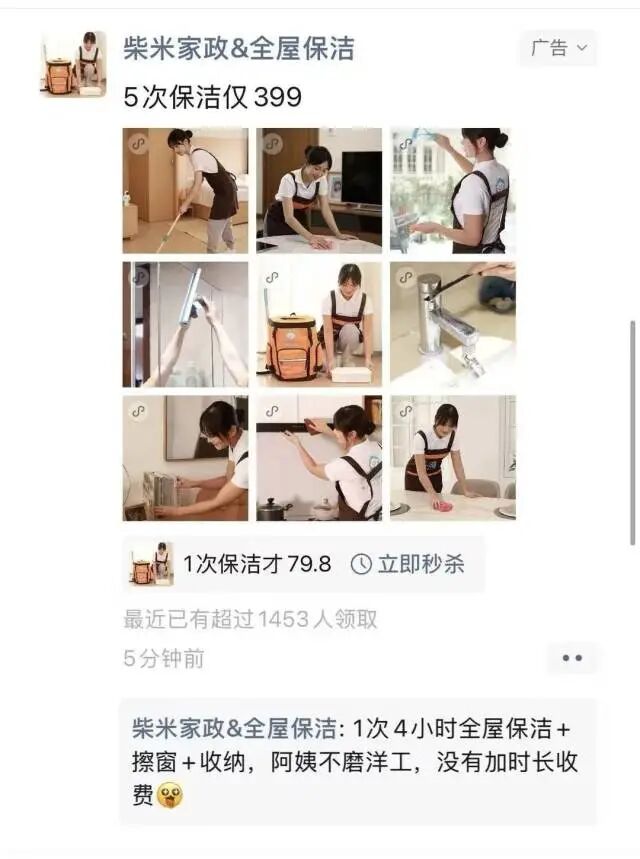 近日,多名消费者向记者爆料,通过微信朋友圈推送的家政服务广告购买“柴米家政”等相关品牌的保洁卡后,遭遇服务中断、客服失联、退款无果的情况,涉及金额从数百元到数千元不等,涉及的消费者有数百人。