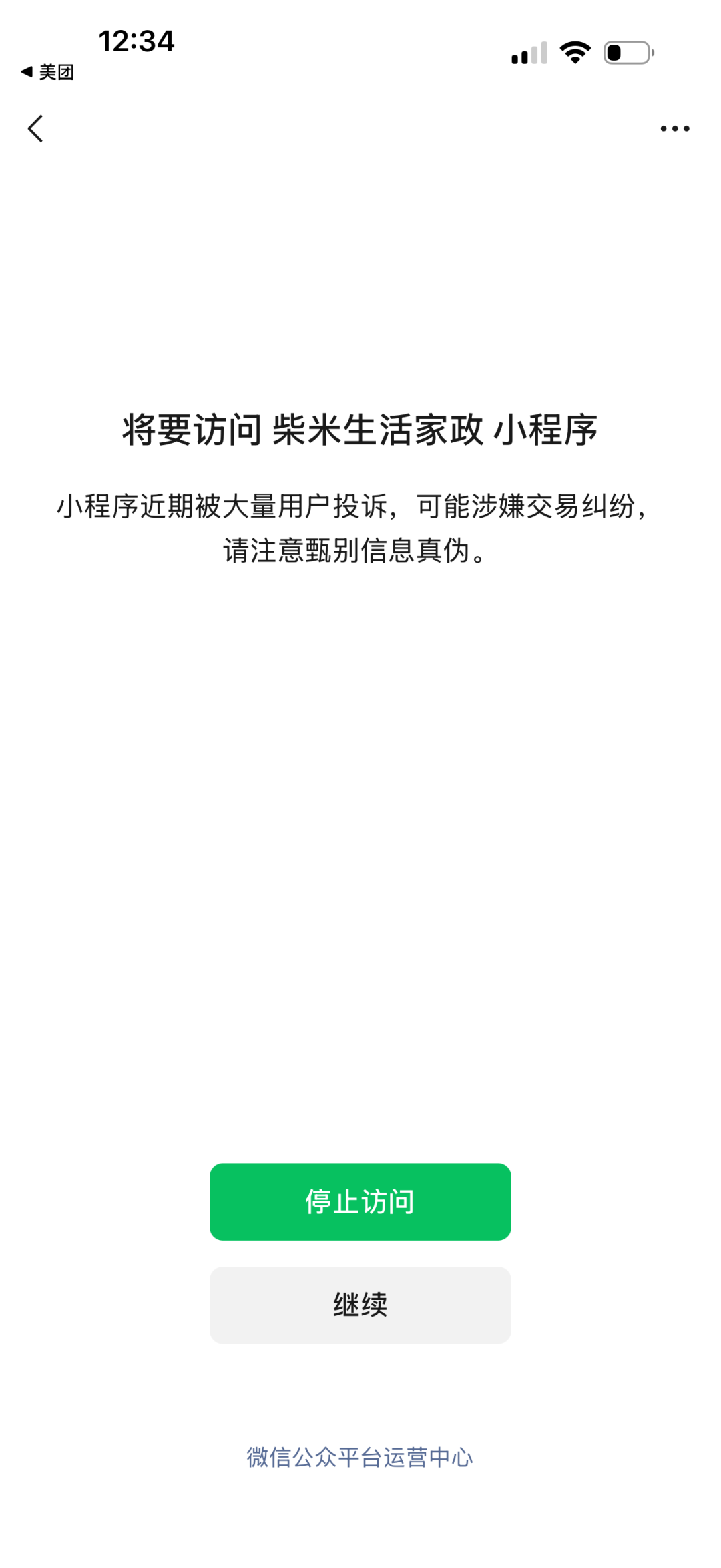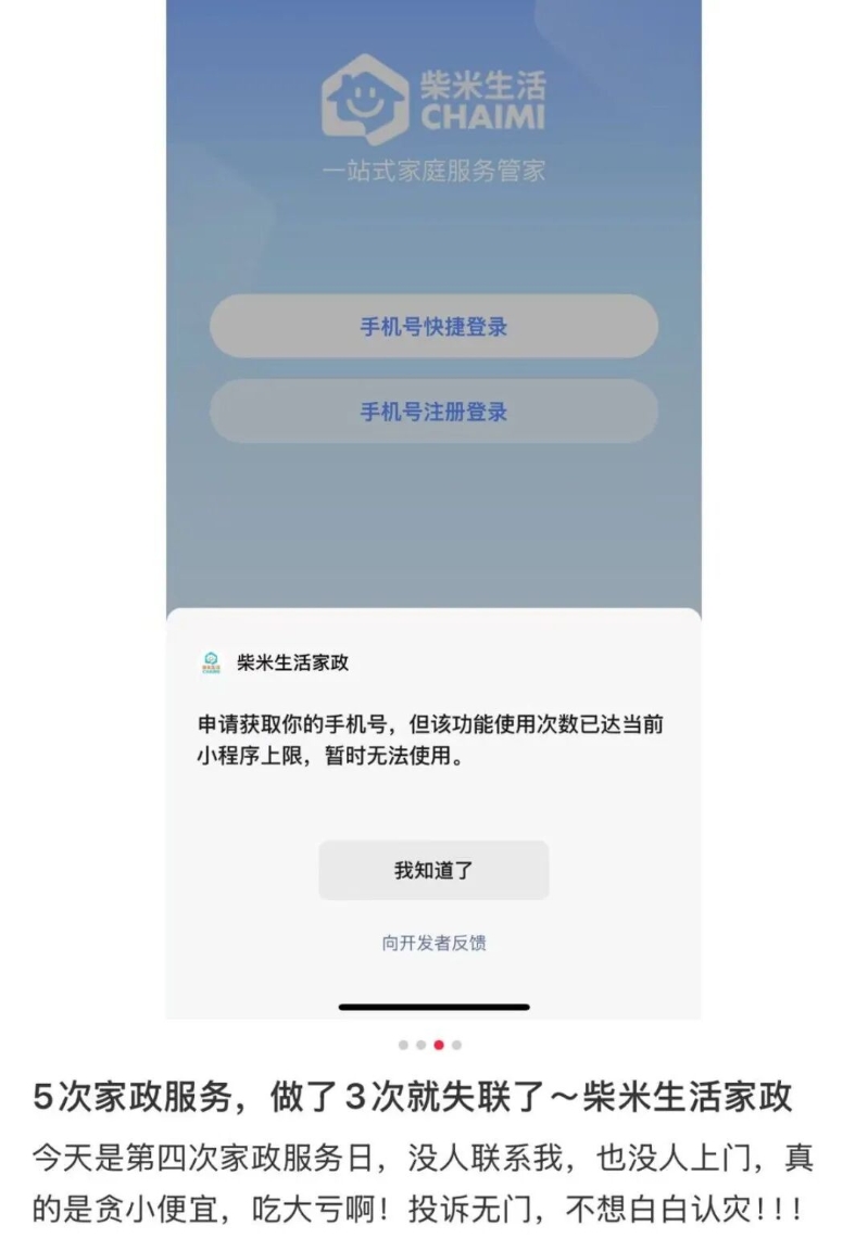 记者搜索柴米生活家政小程序,平台出现风险提示:小程序近期被大量用户投诉,可能涉嫌交易纠纷。当试图用手机号登录时,则显示该小程序暂时无法使用。