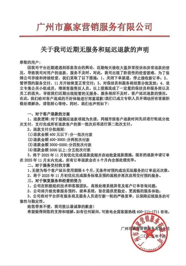 记者在消费者提供的材料中看到,柴米家政的运营公司为广州市赢家营销服务有限公司,位于南沙,其曾发布声明,称因遭遇“恶意攻击的舆论”和“大量异常投诉退款”导致经营困难,宣布关闭下单渠道、暂停预约服务,并制定了分批次退款方案:400元以下一次付清,400—3000元分两批次,3000—5000元分四批次,5000元以上分五批次,承诺2025年11月初启动批量退款,6个月内处理完毕,同时将服务期限延长6个月。