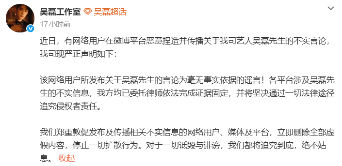 吴磊工作室发声:吴磊先生与该博主素不相识,无任何交集!也感谢所有关心及为吴磊先生发声的朋友,对于此类卑劣行径,我方会积极应对,必将依法维权到底!我们相信时间会证明真心,但也会手持利刃,让真诚有力可言!