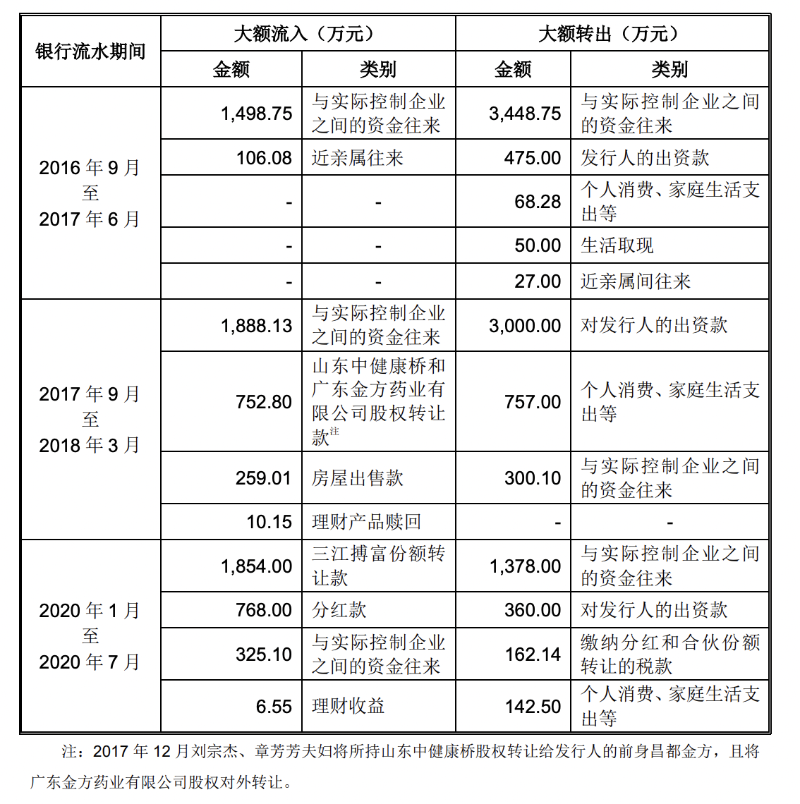 对此,北交所要求中健康桥:结合刘宗杰、章芳芳夫妇在医药行业的创业投资和经营情况,以及历次直接或间接出资(包括受让股权或份额)前后银行流水情况,进一步说明刘宗杰、章芳芳夫妇出资来源的真实合法性,并结合所得公司分红款的用途和去向进一步论证所持股份的真实性。