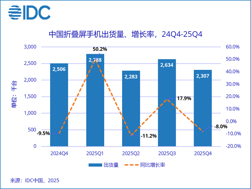 在折叠屏领域,2025年四季度中国折叠屏手机出货量达到231万台,同比下降8.0%。2025年全年,中国折叠屏手机市场仍保持同比增长9.2%,出货量约1001万台,但增长动能有所放缓。